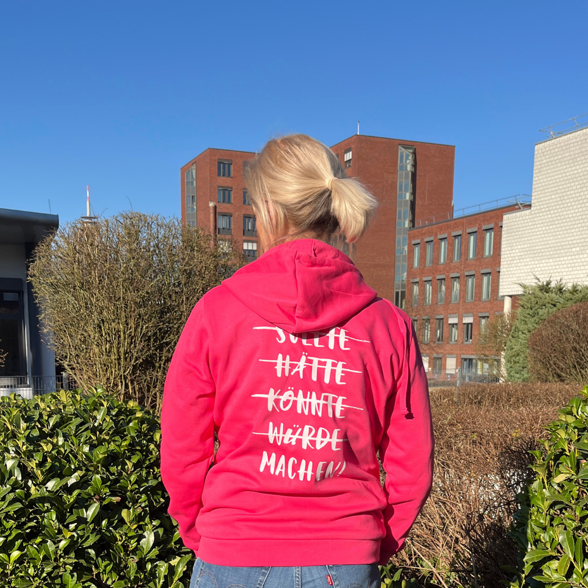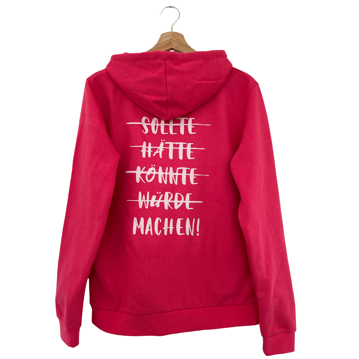 Der leuchtende Pinkton und der markante Backprint "Sollte Hätte Könnte Würde Machen!" machen diese Sweatjacke zu einem echten Hingucker. Dank der leicht taillierten Passform, der weichen, angerauten Innenseite und der elastischen Bündchen bietet sie optimalen Tragekomfort. Die doppellagige Kapuze mit Kordelzug und die praktische Kängurutasche runden das Design ab. Ein stylischer Hoodie für jede Gelegenheit – ob bei der Arbeit oder in der Freizeit.